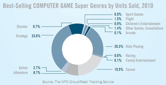 В плане жанров 21,7% держат за собой экшены, за которыми с 16,3% стоят спортивные игры и с 15,9% шутеры. Впрочем, в случае с PC ситуация немного иная. В действительности, владельцы клавиатур и мышей предпочитают стратегии (33,6%), ролевые игры (20,3%) и даже казуальные (офисные) игры (19,5%), что без сомнения связано с ростом популярности бесплатных веб-основанных игр, вроде тех, что вы можете встретить на Facebook.